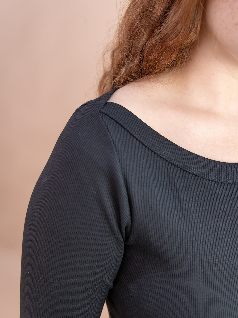 La samarreta Edith Negre és una d'aquelles peces que no poden faltar a l'armari. Amb el seu teixit de canalé elàstici el seu coll vaixell ampli, combinen elegància i senzillesa. El punt de bambú i cotó li dóna una sensació suau i confortable, ideal per al dia a dia o per a looks més arreglats.