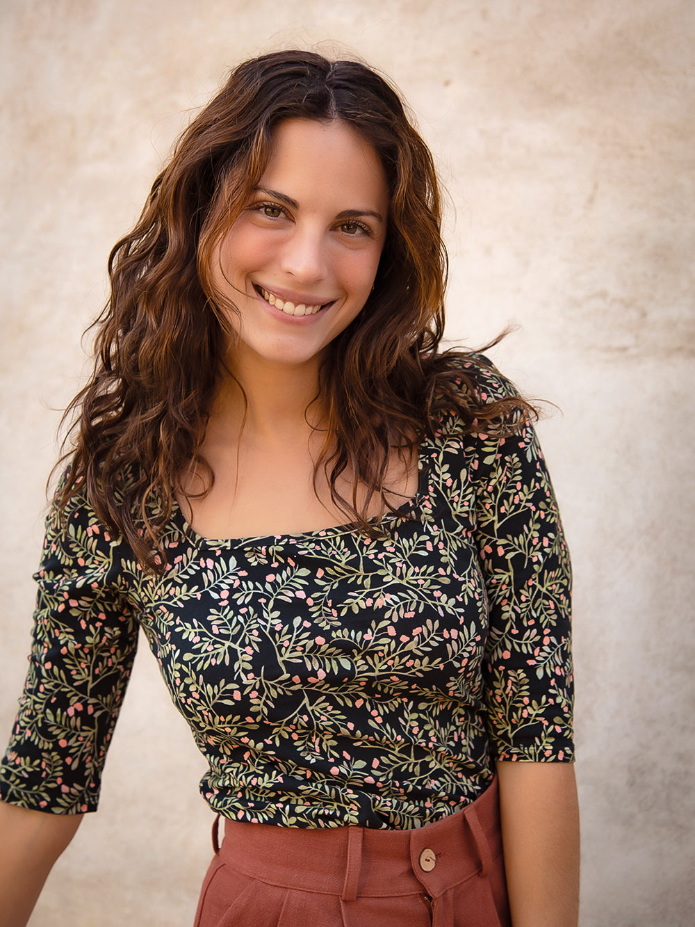 Pair it with straight-leg pants, midi skirts, or even high-waisted jeans. You can play with accessories or wear it as is: the print does the trick. It also looks lovely under a cardigan (it pairs great with our Valeria jackets).