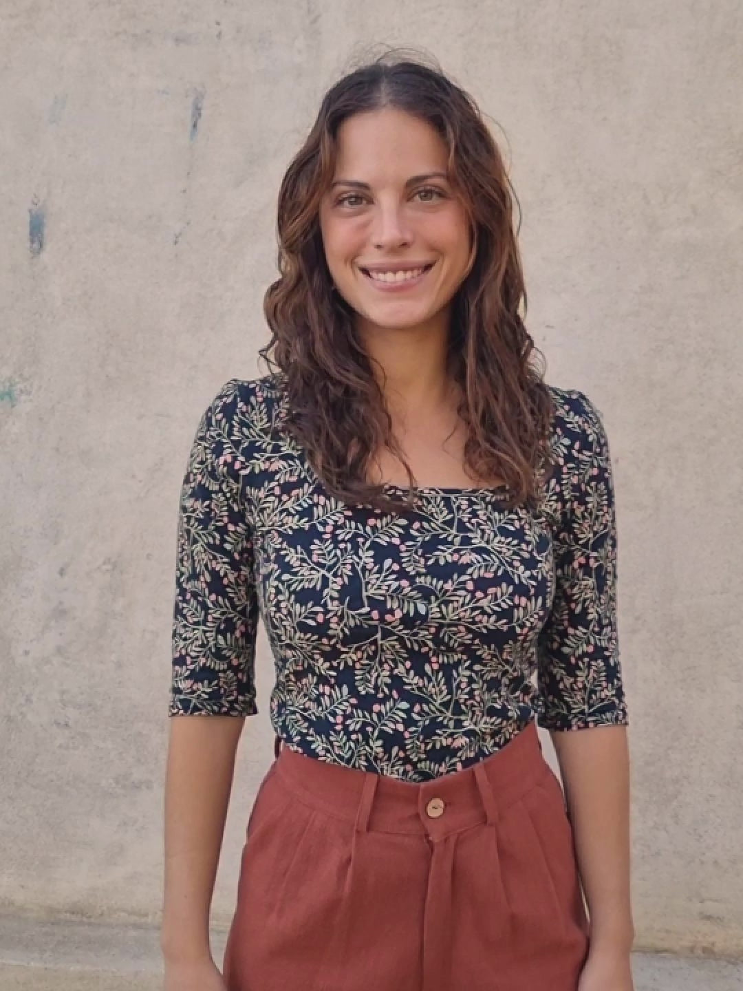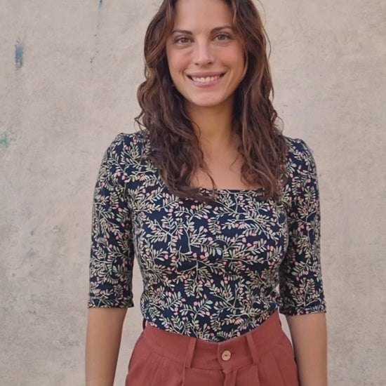 The Margot T-shirt is an elegant and comfortable fitted style, designed to make you feel stylish and special every day, without sacrificing the comfort of a T-shirt and soft knit fabric. It features a square neckline at the front and a closed, rounded neckline at the back, and three-quarter sleeves measuring approximately 36 cm. The Liana fabric stands out for its dark floral print with green and pink accents, giving it an elegant and distinctive touch. Perfect for when you're looking for a T-shirt that stands out on its own.