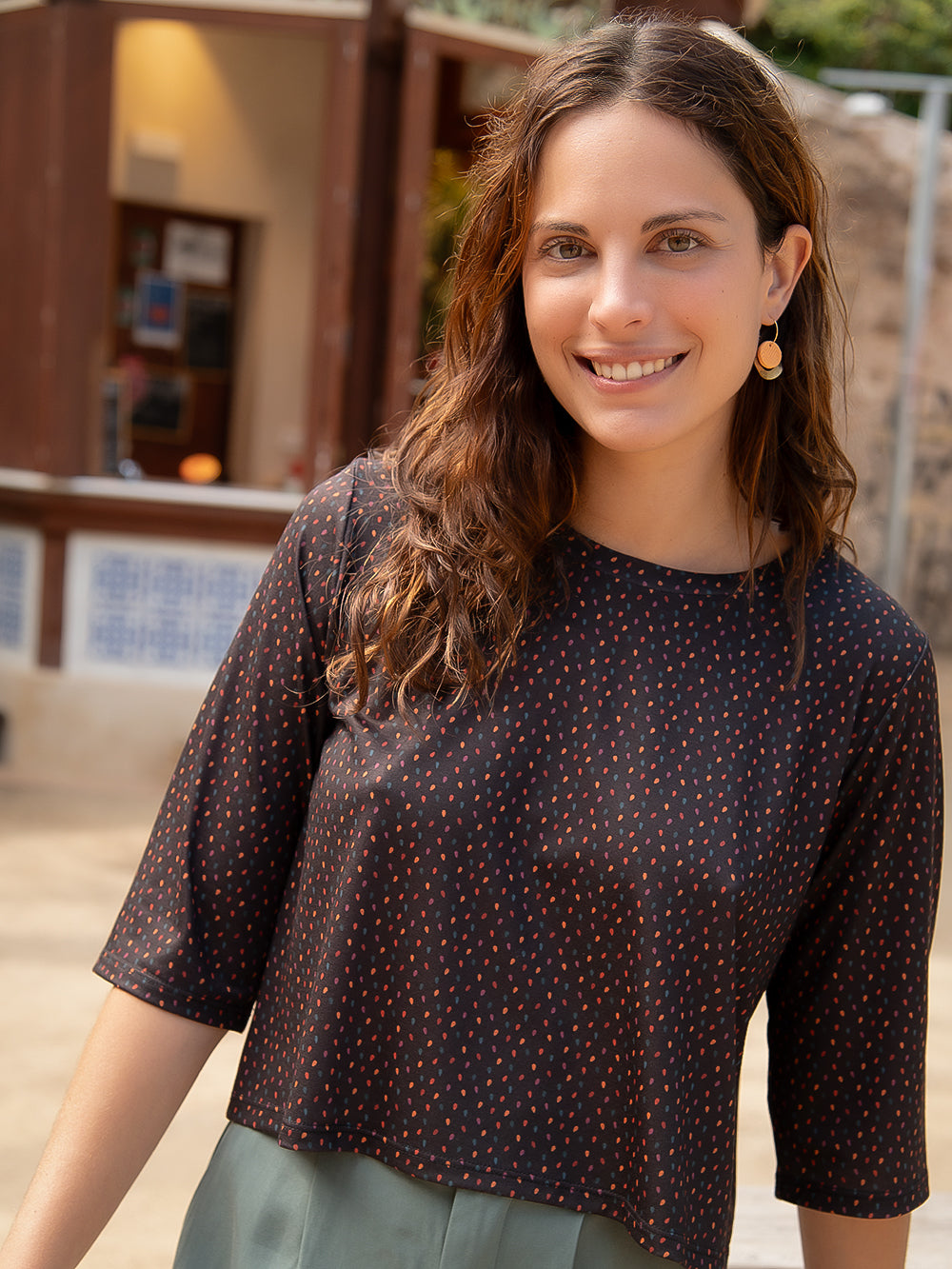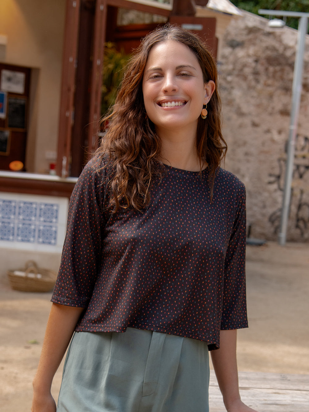 La camiseta Noa es perfecta para esos días en los que buscas algo sencillo pero especial. Con su cuello redondo cerrado, su manga francesa y el corte amplio y corto, ofrece comodidad y estilo a partes iguales. Su silueta cuadrada y la sisa recta hacen que sea una prenda fresca y moderna. El estampado propio Drops, diseñado en exclusiva para esta temporada, combina un fondo oscuro con gotas de colores en tonos vivos. Un diseño geométrico alegre que da un toque original a cualquier look.