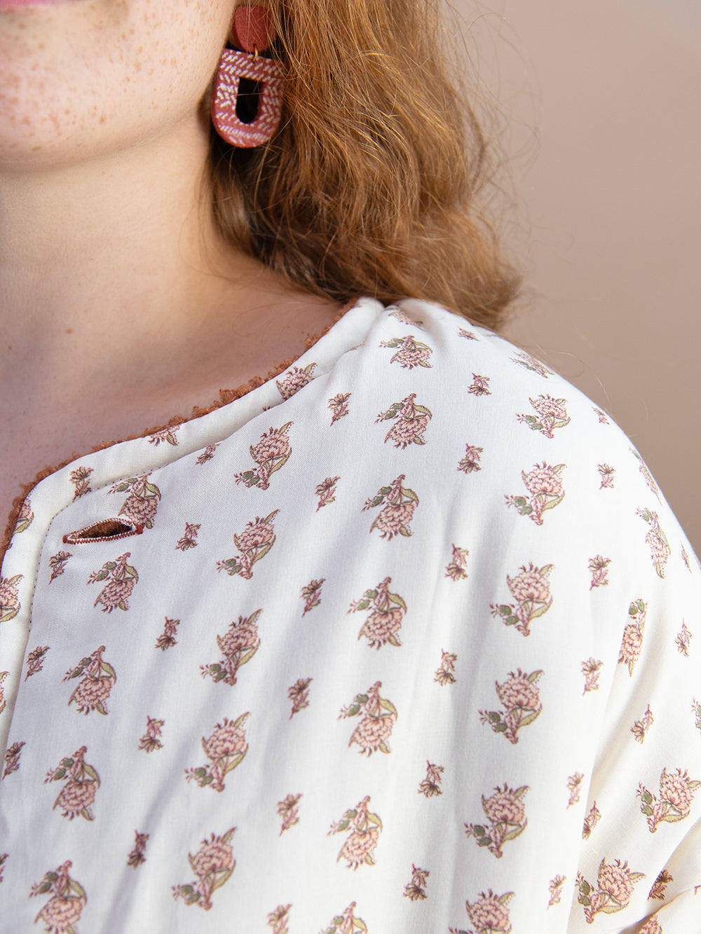 The Clara Ginger jacket combines warmth and texture in a garment designed for the colder months. Its soft, sherpa-like outer fabric in a terracotta tone has a warm and fluffy finish, while the cotton lining with a floral print adds a delicate and playful touch. Between the two fabrics there is a layer of recycled polyester wadding , providing thermal insulation without adding weight. The relaxed fit with dropped armholes and natural coconut buttons complete its handcrafted and comfortable design.
