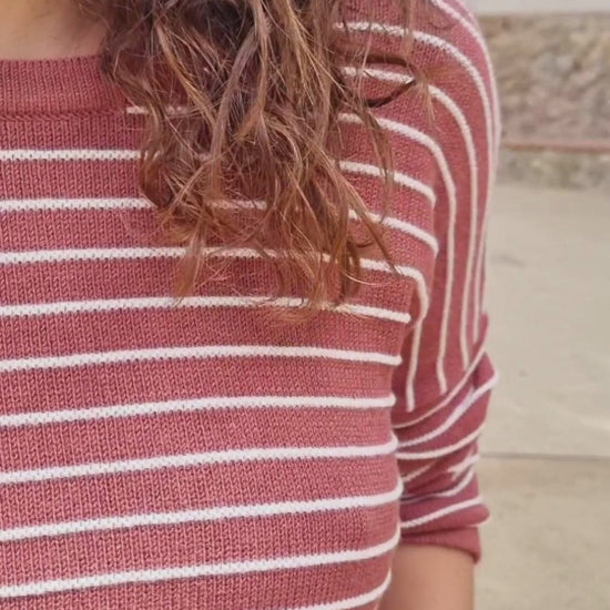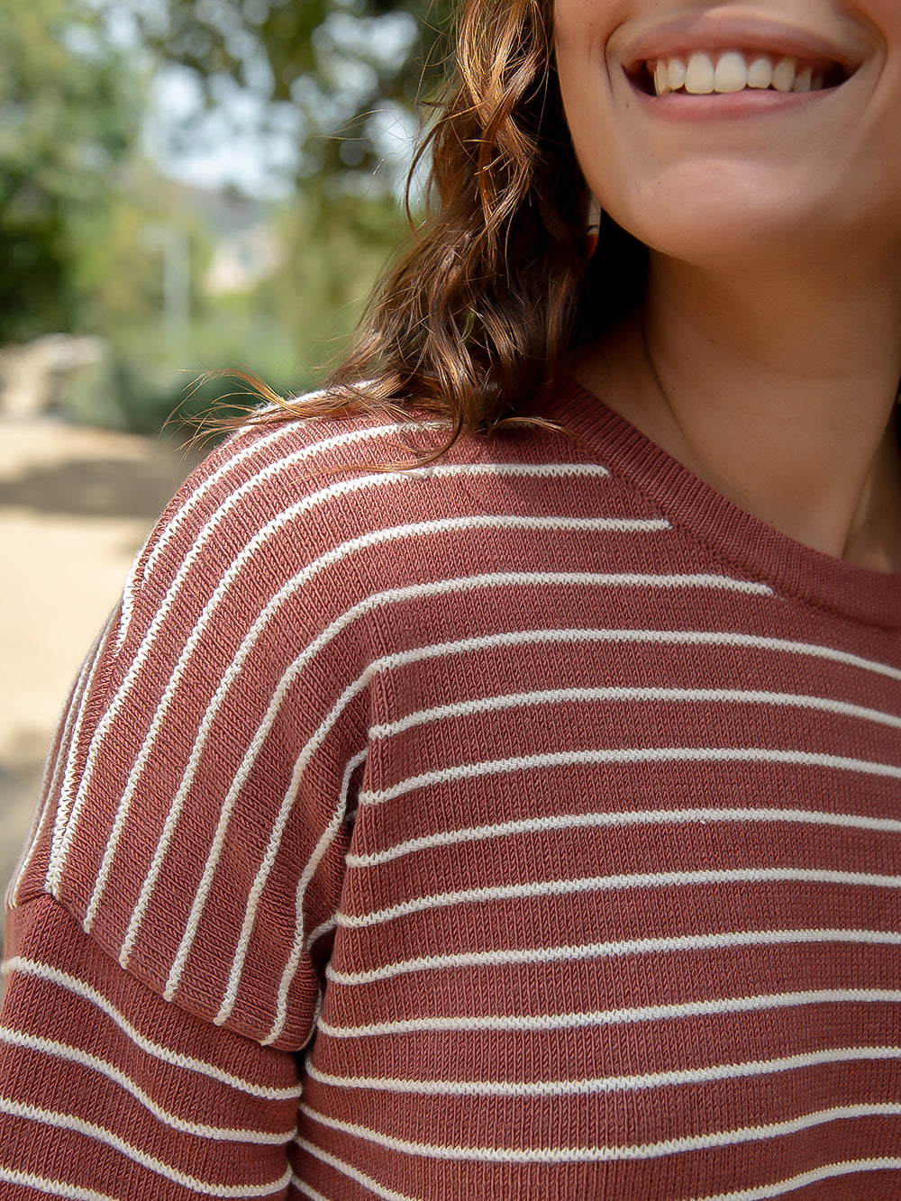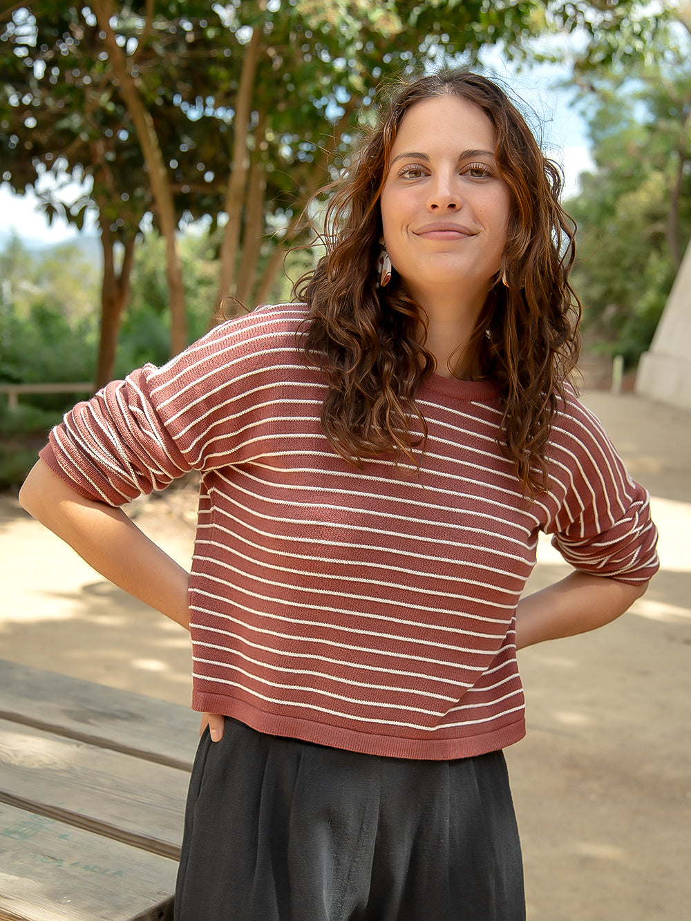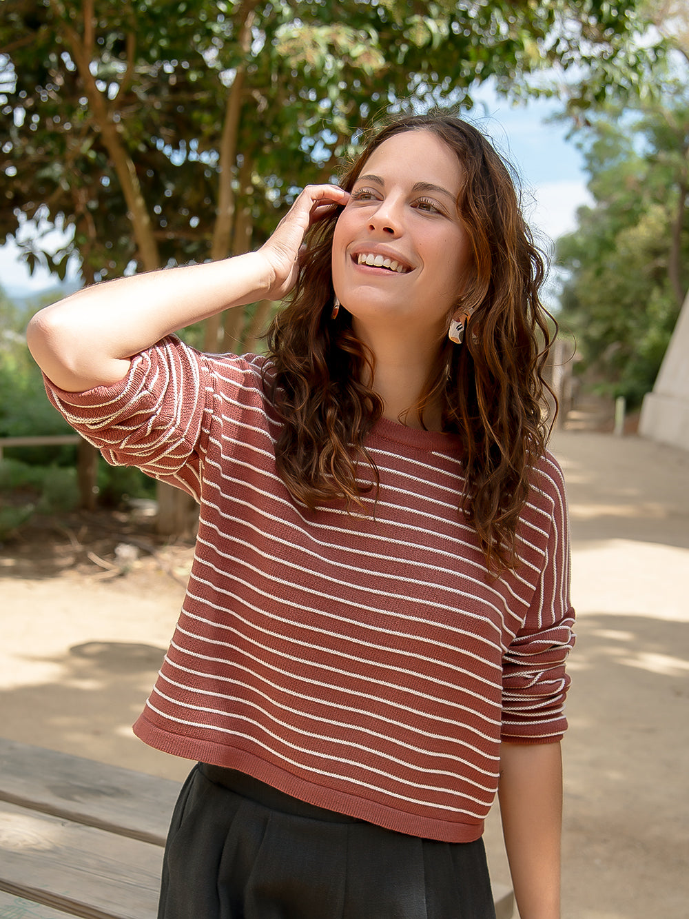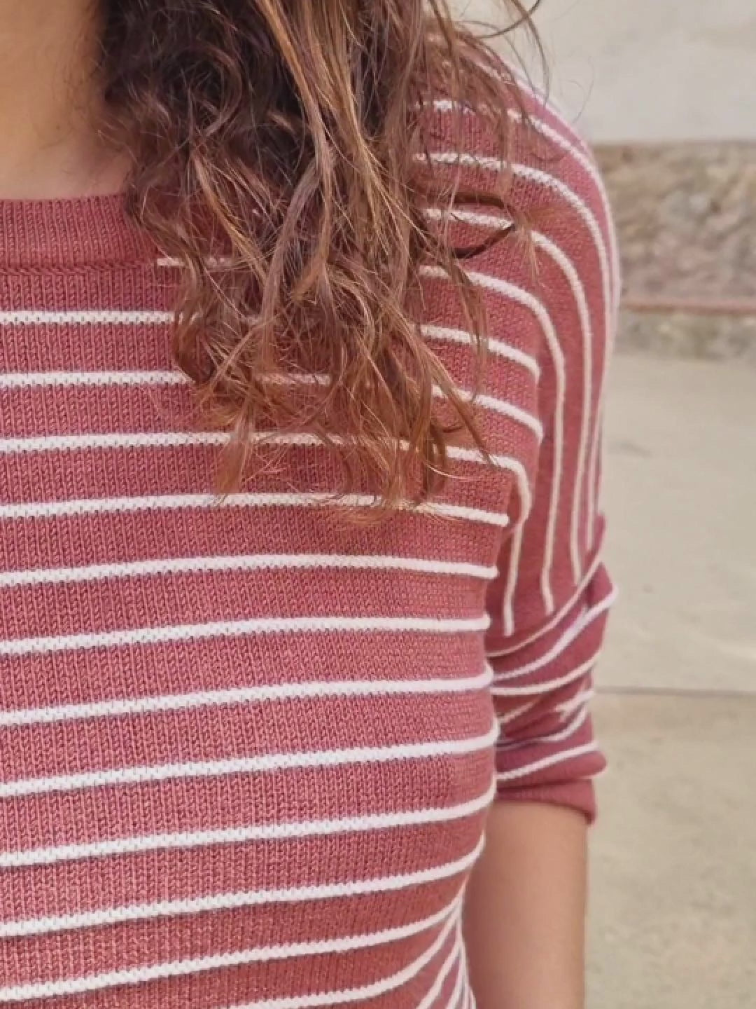El jersey Asha es ya uno de nuestros clásicos más cómodos y favorecedores. Con sisa caída y cuello redondo, tiene un diseño ancho y relajado que se adapta a todos los cuerpos. Su tejido en punto listado con relieve, aporta ligereza y una caída muy bonita, perfecta para llevar en el día a día. El modelo Candem combina un fondo merlot, un teja rojizo, con líneas en tono beige, una mezcla cálida y especial que da personalidad a cualquier look. El hilo, de producción local, ha sido teñido especialmente para esta colección en estos dos colores.