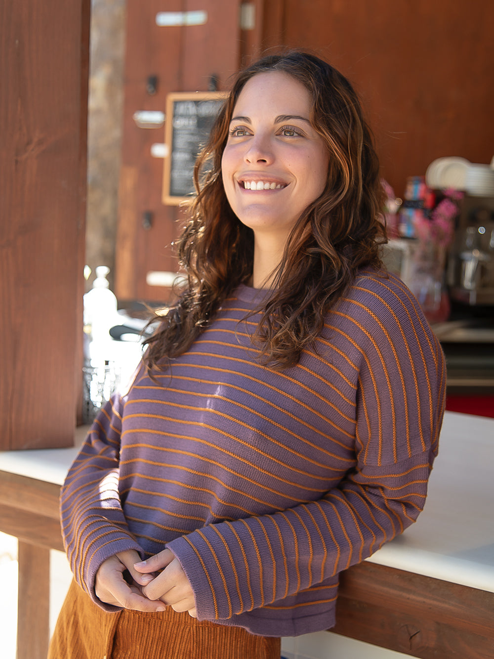 El jersey Asha es ya uno de nuestros clásicos más cómodos y favorecedores. Con sisa caída y cuello redondo, tiene un diseño ancho y relajado que se adapta a todos los cuerpos. Su tejido en punto listado con relieve, aporta ligereza y una caída muy bonita, perfecta para llevar en el día a día. El modelo Magma combina un fondo malva con líneas en tono mel, una mezcla cálida y especial que da personalidad a cualquier look. El hilo, de producción local, ha sido teñido especialmente para esta colección en estos dos colores.