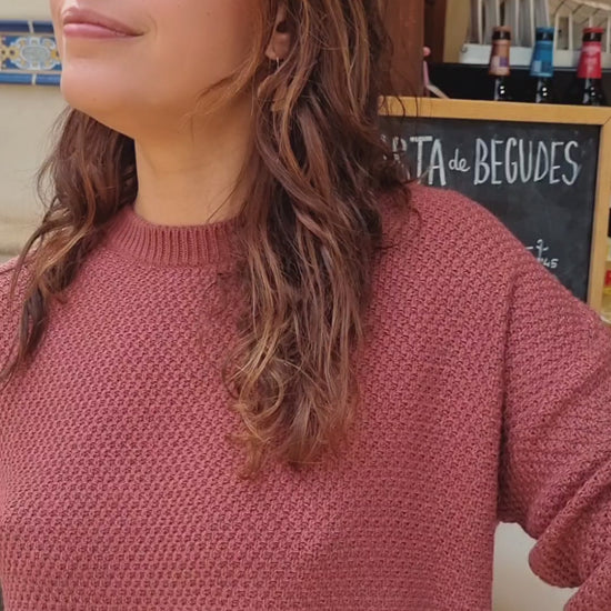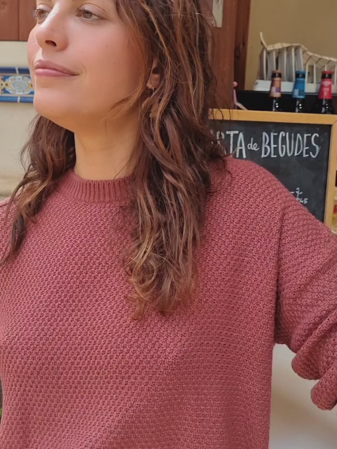 El jersey Lia es uno de esos básicos especiales que siempre apetece tener cerca. Con su patrón oversize, sisa caída y cuello redondo, transmite una sensación de comodidad absoluta sin renunciar al estilo. Su punto grueso y con textura le da personalidad y hace que la prenda tenga cuerpo y caída. Es un modelo que se adapta fácilmente a diferentes estilos y momentos del día, perfecto para cuando buscas algo práctico pero con un toque diferente. El hilo, de producción local, ha sido teñido especialmente para esta colección en estos dos colores: malva y merlot.
