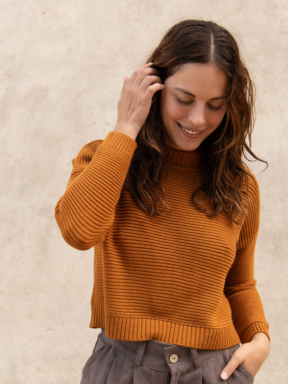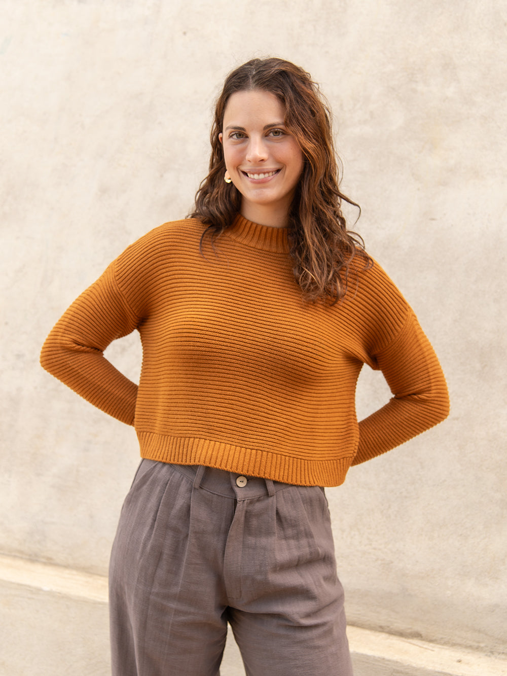 El jersey Salina es un modelo de corte recto y corto, pensado para aportar comodidad sin perder estilo. Con sisa caída, cuello redondo y manga larga, tiene un aire moderno y desenfadado que se adapta fácilmente a tu día a día. Su punto estructurado, un canalé en horizontal, le da peso y consistencia, lo que lo convierte en una prenda especial dentro de los básicos. El color mel es cálido y con carácter, perfecto para dar un toque diferente a tus looks de temporada.