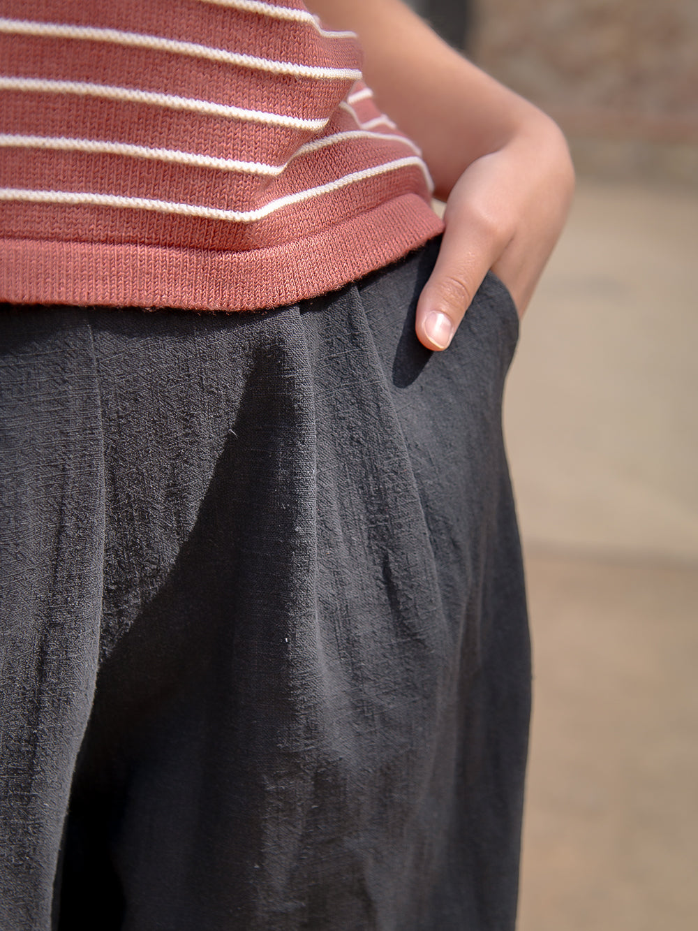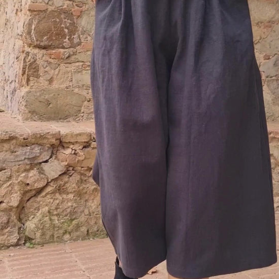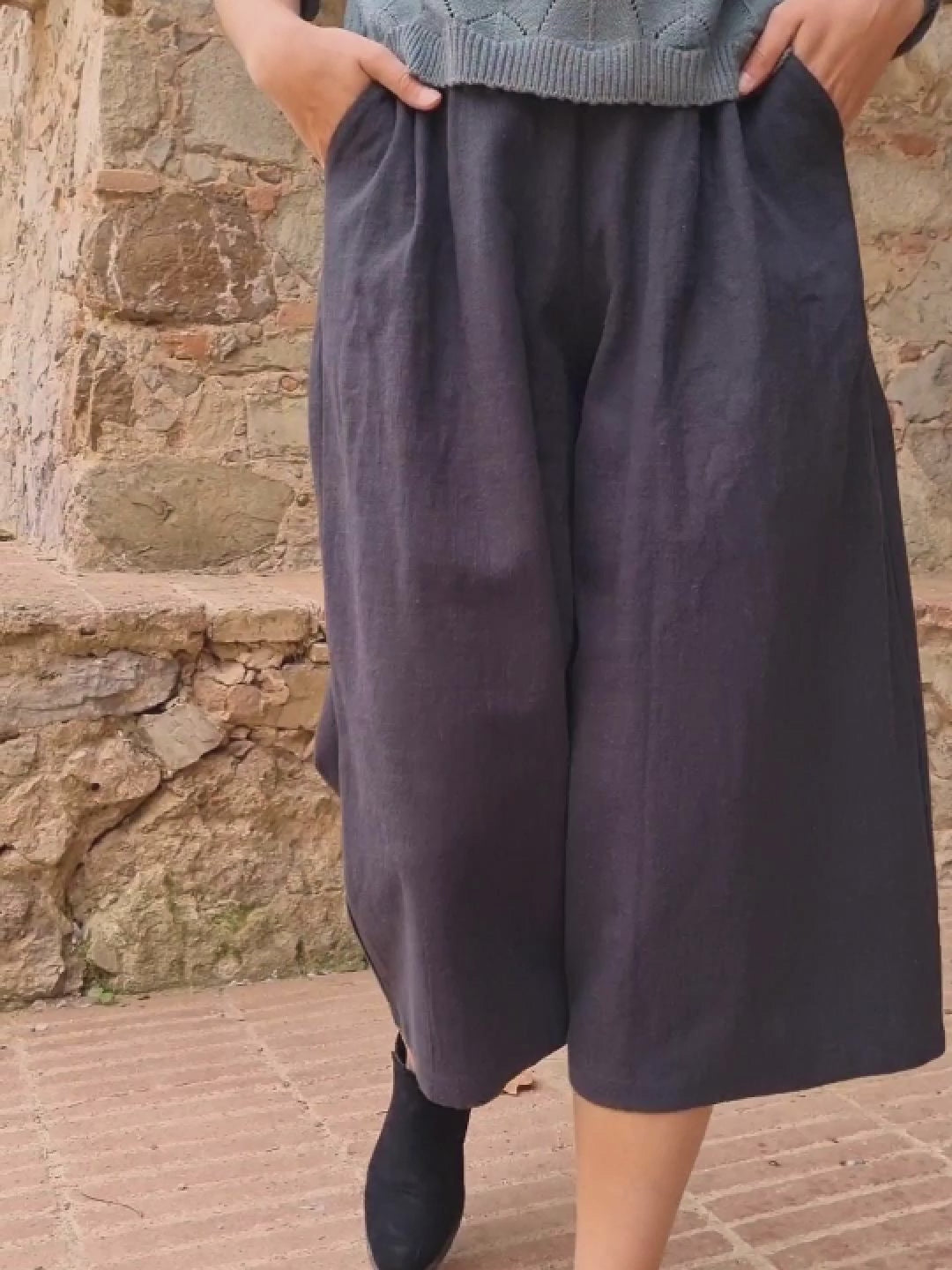 Pantalones de cintura alta y de corte recto largos hasta las pantorrillas, justo por debajo de las rodillas. Tienen pinzas y una cinturilla ancha por delante y con goma por detrás. Al tener goma, los pantalones se adaptan muy bien a la cintura y hacen que la prenda sea muy cómoda.