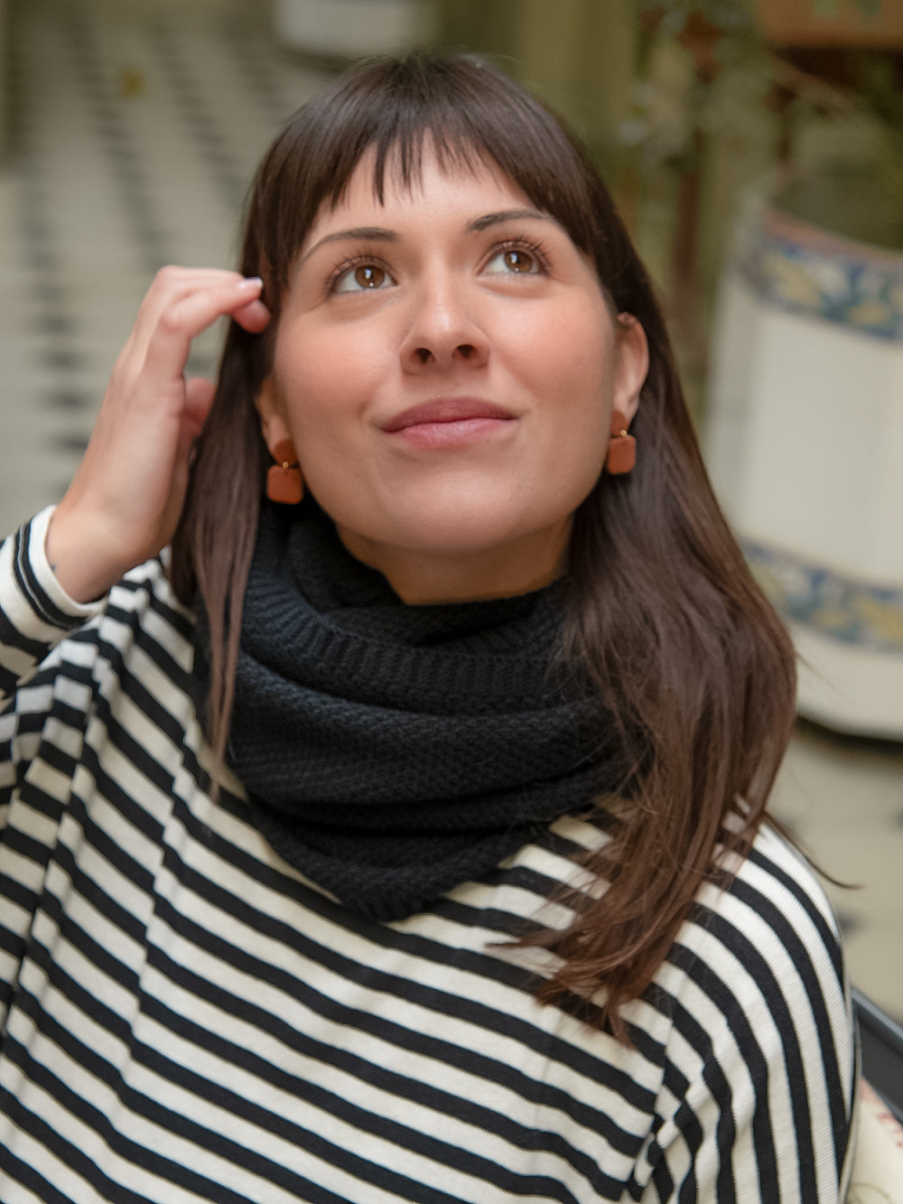 Rice-knit collar with ribbed edging. The collar's length allows it to be wrapped twice for a secure and warm fit.