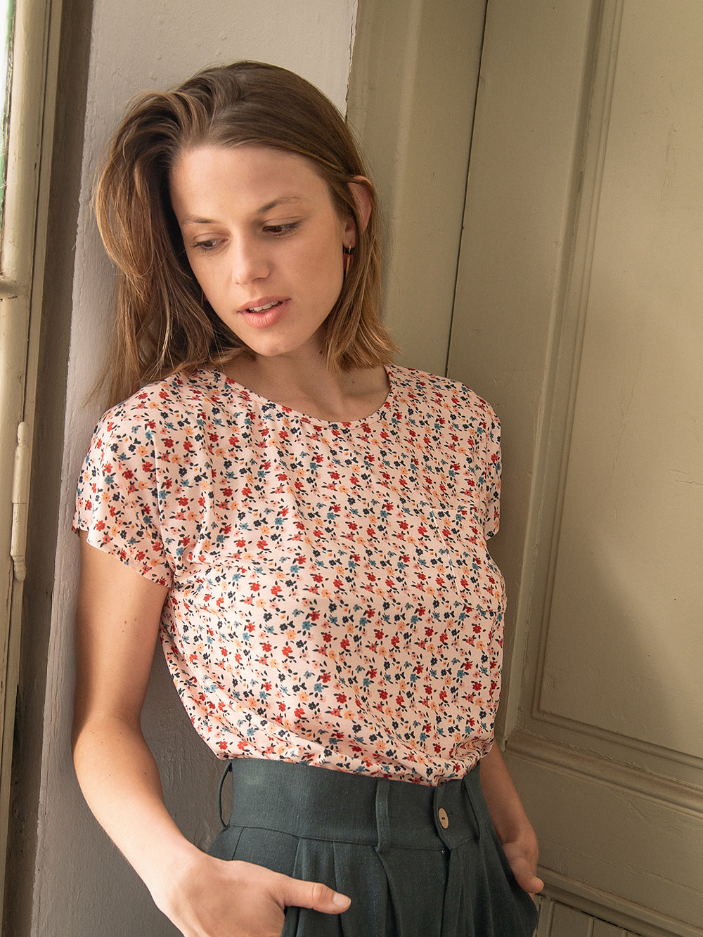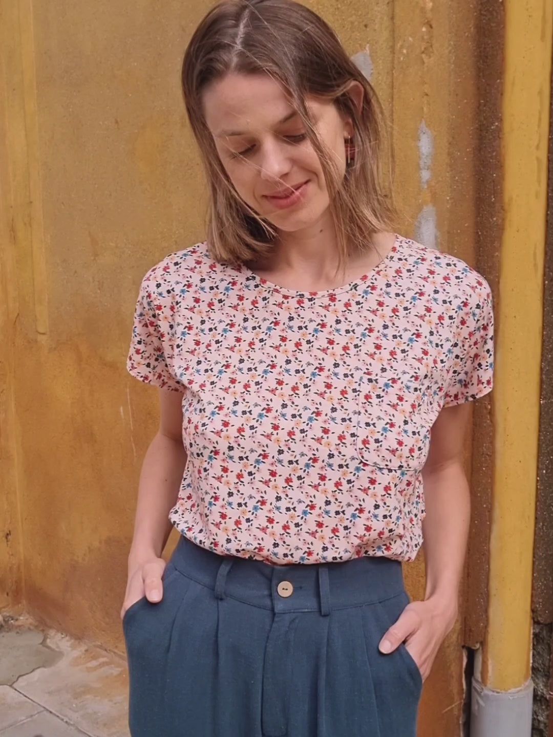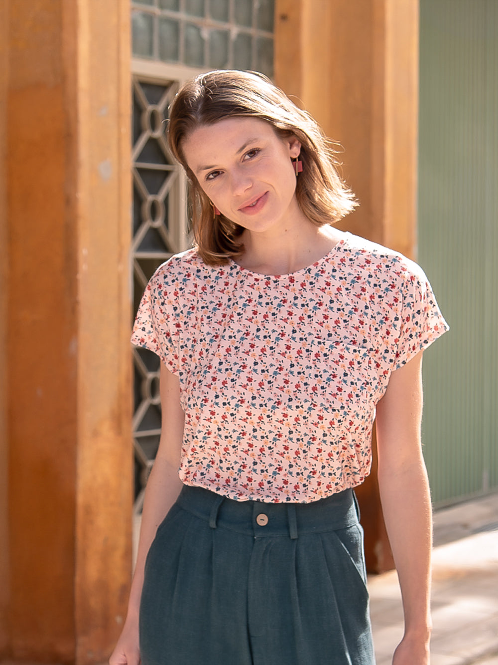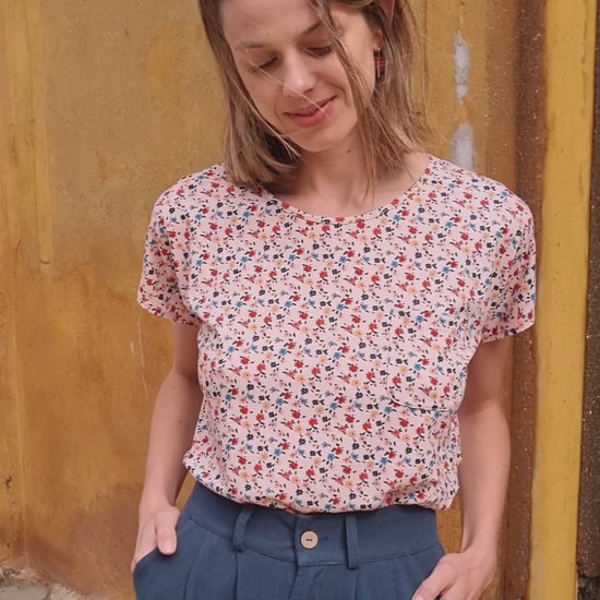 La camiseta Arlet Klimt es uno de los patrones icónicos de Antonieta, de los que hemos repetido temporada tras temporada porque sienta bien y es fácil de llevar. Tiene manga corta sin sisa marcada, cuello redondo no muy cerrado y tiene un pequeño bolsillo en el delantero izquierdo, un detalle sutil que forma parte de su esencia.