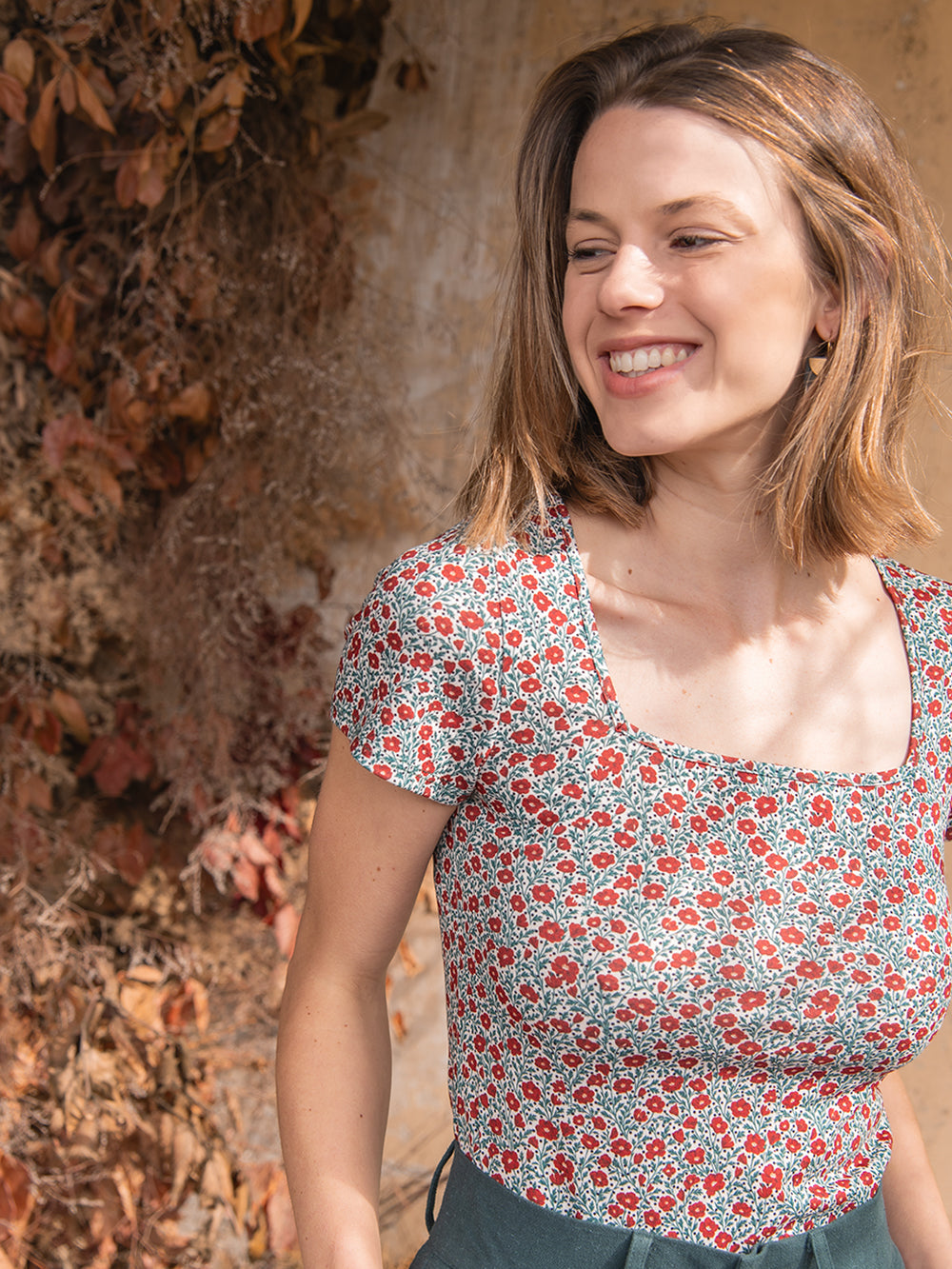 El tejido estampado, con diseño propio de Antonieta, tiene un tacto suave y agradable y se adapta bien al cuerpo, creando una silueta definida sin resultar rígida. El estampado amapola aporta frescura y carácter, haciendo que la camiseta tenga presencia por sí sola.