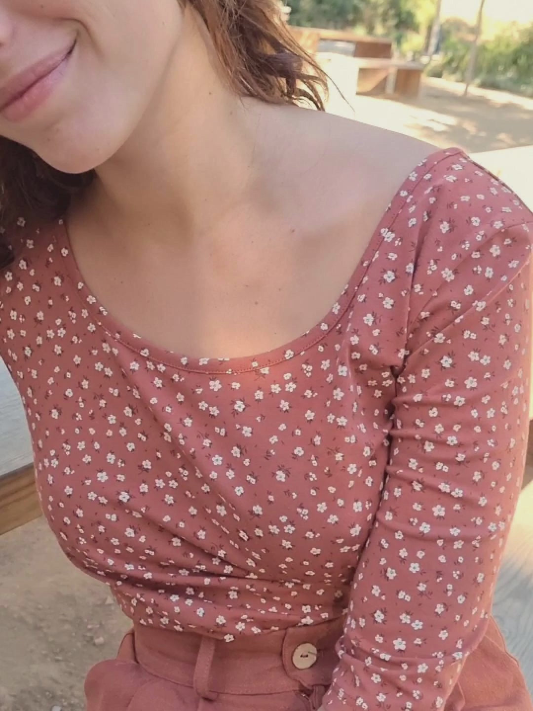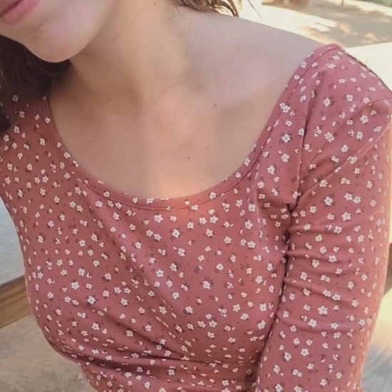 La camiseta Mei es un modelo cómodo y versátil, con manga por encima del codo y un escote amplio de líneas redondeadas. Tiene un cuerpo recto y fluido, que se ajusta al cuerpo y acompaña la silueta. Está confeccionada en un punto de algodón muy agradable, con certificado Oeko-Tex, ideal para el día a día. El estampado Grace es un fondo teja con florecitas claras, suave y delicado, perfecto para dar un toque romántico a tu look.