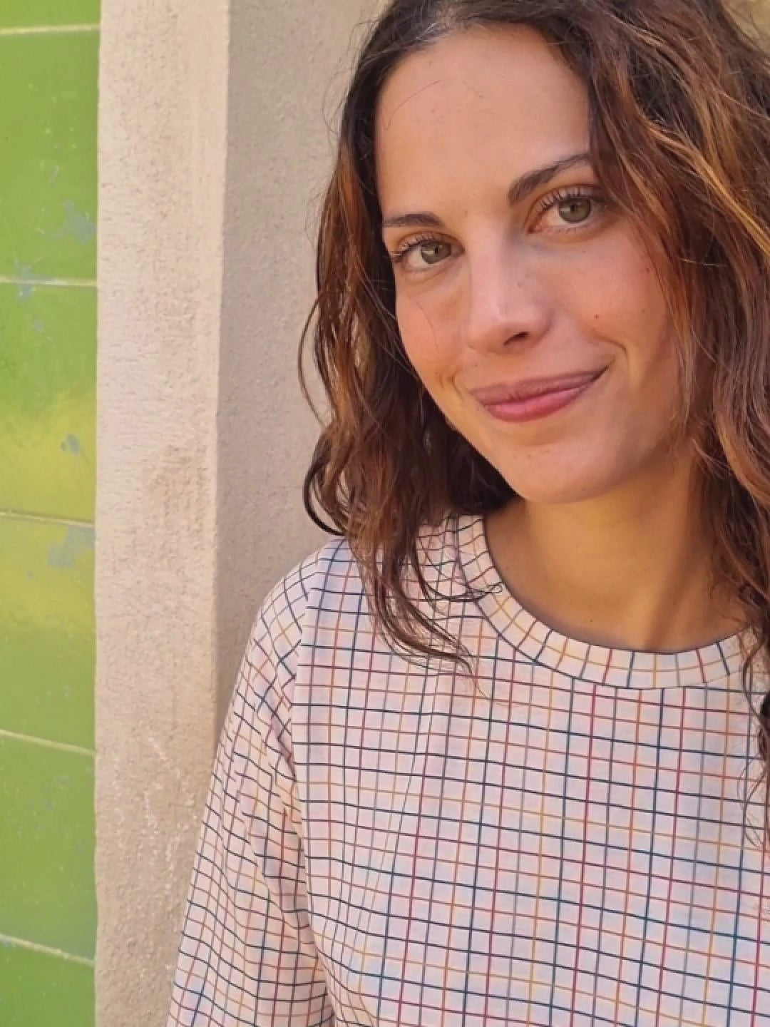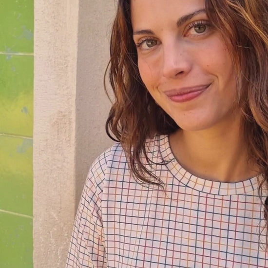 La camiseta Noa es un modelo con patrón amplio y corto, de aspecto cuadrado, muy cómoda y favorecedora. Tiene el cuello redondo y cerrado, la manga francesa a la altura del codo y la sisa recta, lo que aporta un aire desenfadado y actual. El tejido es un punto suave y adaptable, con estampado propio Picnic, un diseño geométrico de cuadros de colores que hemos creado especialmente para esta temporada. Una prenda diferente que aporta color y personalidad sin perder comodidad.