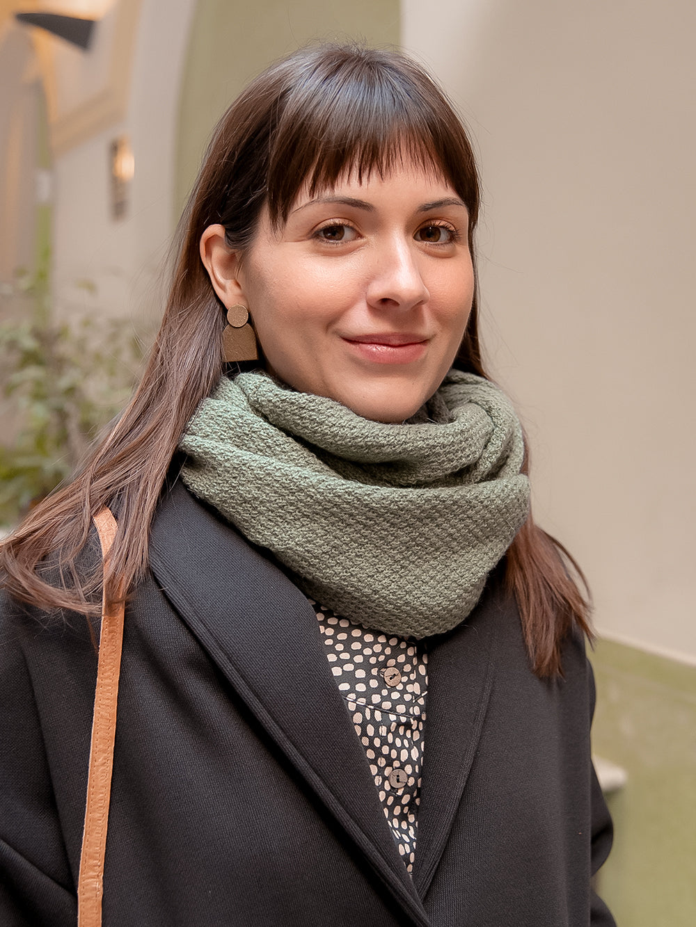 Cuello de punto de arroz y canalé en los acabados. El largo del cuello permite dar dos vueltas para que quede bien sujeto y abrigue.
