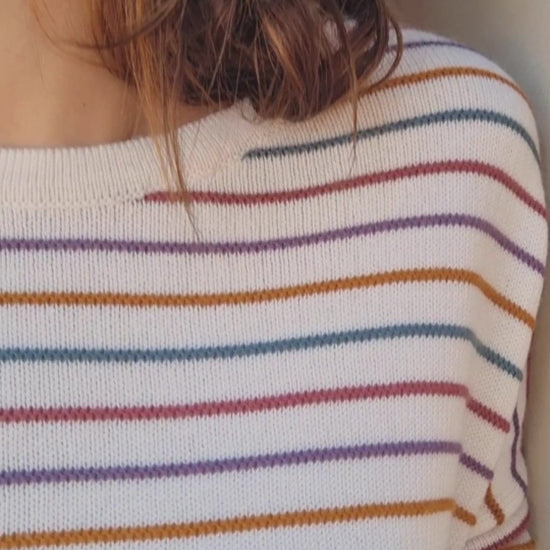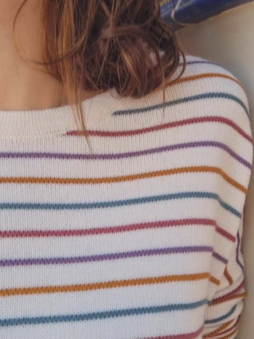 El jersey Asha es ya uno de nuestros clásicos más cómodos y favorecedores. Con sisa caída y cuello redondo, tiene un diseño ancho y relajado que se adapta a todos los cuerpos. Su tejido en punto listado con relieve, aporta ligereza y una caída muy bonita, perfecta para llevar en el día a día. El modelo Prisma se presenta con un fondo beige i lineas de colores en horizontal. El hilo, de producción local, ha sido teñido especialmente para esta colección en una paleta de cuatro colores (malva, merlot, bruc y mel), logrando matices únicos que la hacen aún más especial.