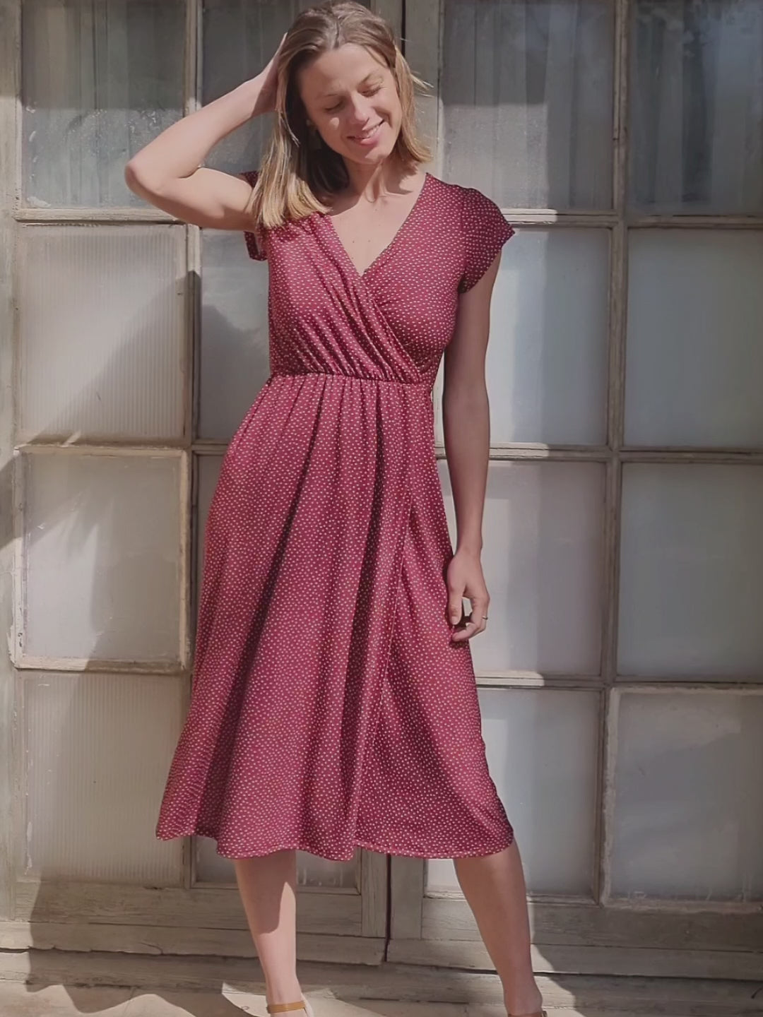 El vestido Gala Dots es un vestido midi de punto, con largo entre la rodilla y el tobillo, escote cruzado y manga corta. La silueta es femenina y equilibrada, con una caída natural que acompaña el movimiento sin marcar en exceso.