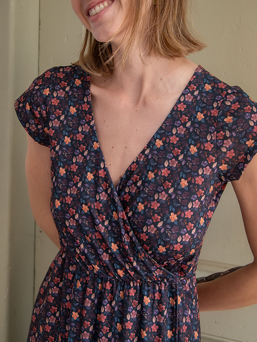 El estampado Lilac, también diseño propio de Antonieta, combina profundidad y contraste sobre una base de punto muy suave y con gran caída. El tejido tiene un tacto agradable y fluido, que se adapta al cuerpo con naturalidad.
