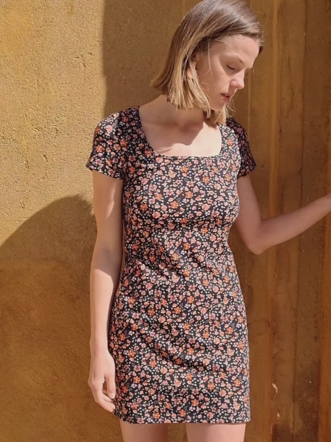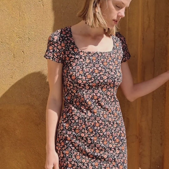 Tiene manga corta y un largo por encima de la rodilla que lo hace muy versátil. El tejido del modelo Nenúfar tiene un poco más de gramaje que la versión en negro, lo que aporta mayor cuerpo y una sensación de estructura suave. El estampado floral sobre fondo oscuro añade profundidad y un aire romántico muy equilibrado.
